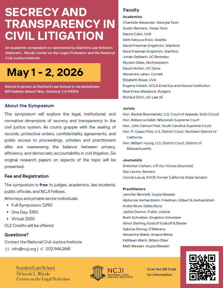 May 1-2, 2026 The National Civil Justice Institute and Stanford Law School’s Deborah L. Rhode Center on the Legal Profession will cosponsor an academic symposium at the law school campus in Palo Alto, CA. This symposium will explore the legal, institutional, and normative dimensions of secrecy and transparency in the civil justice system. As courts grapple with the sealing of records, protective orders, confidentiality agreements, and public access to proceedings, scholars and practitioners alike are reassessing the balance between privacy, efficiency, and democratic accountability in civil litigation. Six original research papers on aspects of the topic will be presented.